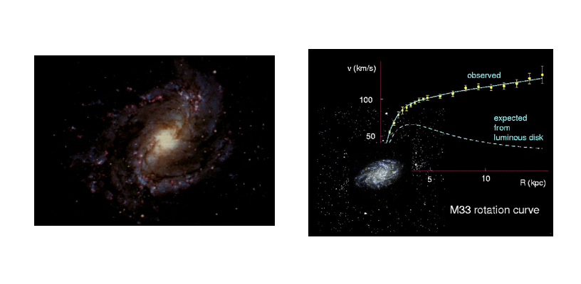 Dalla legge di gravitazione universale di Newton si ricava che in un sistema gravitazionale come quello di una galassia, la velocità delle stelle che si trovano nella regione esterna al nucleo deve decrescere all’aumentare della distanza. Al contrario, le osservazioni effettuate su centinaia di galassie hanno dimostrato che la velocità delle stelle anche lontane dal nucleo era molto maggiore di quella attesa e inoltre non diminuiva con la distanza (Figura 2). Questo può essere spiegato solo se si assume che la galassia contenga della materia invisibile e non concentrata nel nucleo, la cui attrazione gravitazionale è responsabile del moto delle stelle.