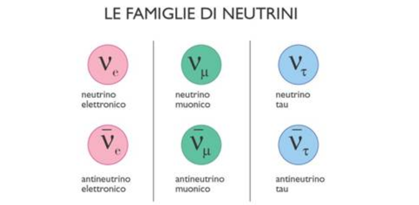 Ogni particella possiede una corrispondente antiparticella: così per ogni neutrino esiste il corrispondente antineutrino; in tutto abbiamo quindi sei tipi di neutrini, come illustrato nella figura.
