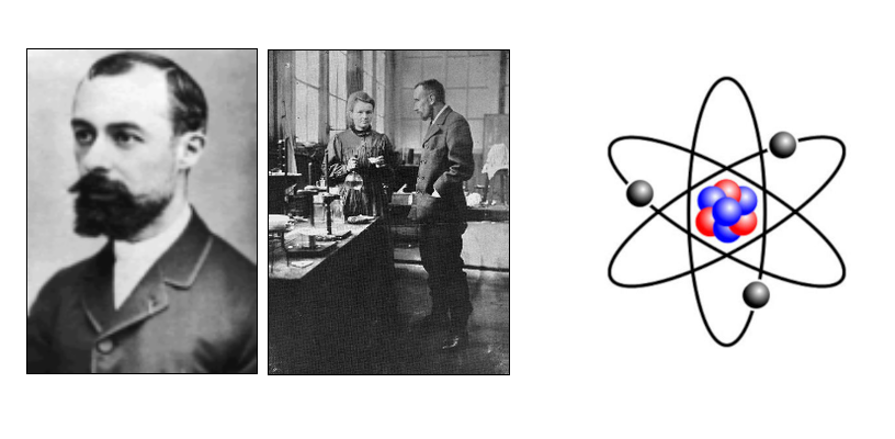 Figura 1: Henry Bequerel e i coniugi Curie - Figura 2: Disegno schematico di un atomo
