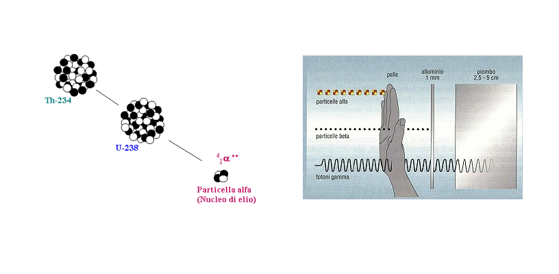 Figura 3: Un decadimento alfa - Figura 4: Il potere penetrante delle diverse radiazioni