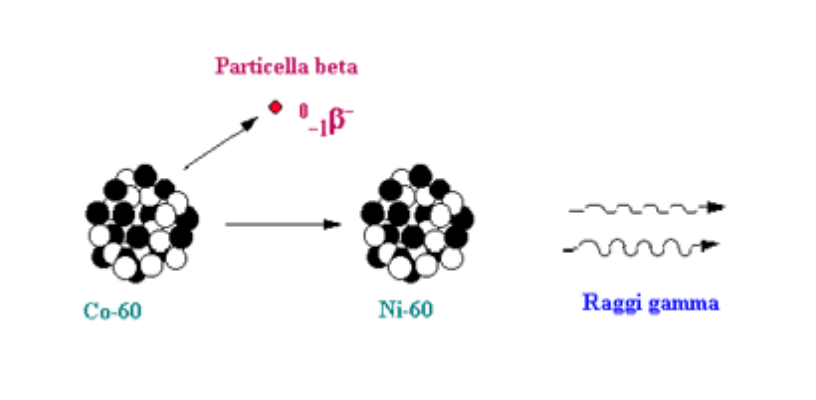 Decadimento Gamma (γ): Il nucleo non si trasforma, ma passa semplicemente in uno stato di energia inferiore ed emette un fotone. La radiazione gamma accompagna solitamente una radiazione alfa o una radiazione beta. Infatti, dopo l’emissione alfa o beta, il nucleo è ancora eccitato perché i suoi protoni e neutroni non hanno ancora raggiunto la nuova situazione di equilibrio: di conseguenza, il nucleo si libera rapidamente del surplus di energia attraverso l’emissione di una radiazione gamma. Per esempio, il cobalto-60 si trasforma per disintegrazione beta in nichel-60, che raggiunge il suo stato di equilibrio emettendo una radiazione gamma (Figura 5). Al contrario delle radiazioni alfa e beta, le radiazioni gamma sono molto penetranti, e per bloccarle occorrono materiali ad elevata densità come il piombo (Figura 4).