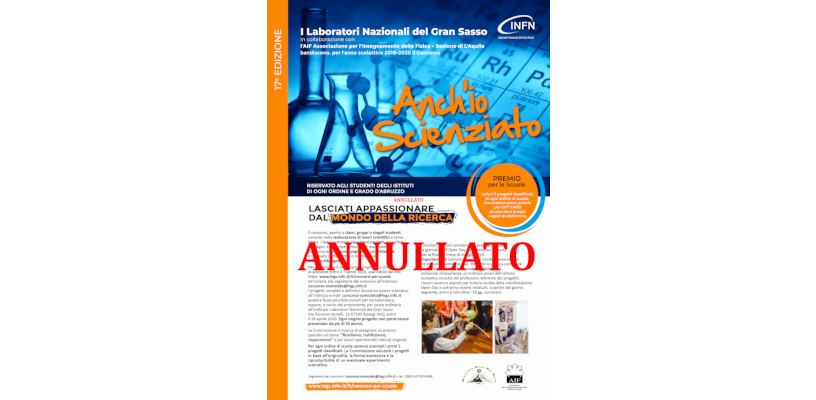 I LABORATORI NAZIONALI DEL GRAN SASSO A SEGUITO DELL’EMERGENZA COVID-19 E DELLA CHIUSURA DELLE SCUOLE DI OGNI ORDINE E GRADO COMUNICANO LA SOSPENSIONE DEL CONCORSO “ANCH’IO SCIENZIATO” 2019-2020 DANDO APPUNTAMENTO A TUTTI GLI STUDENTI ABRUZZESI AL PROSSIMO ANNO SCOLASTICO. IN BOCCA AL LUPO A TUTTI PER UN RAPIDO RITORNO ALLA NORMALITÀ