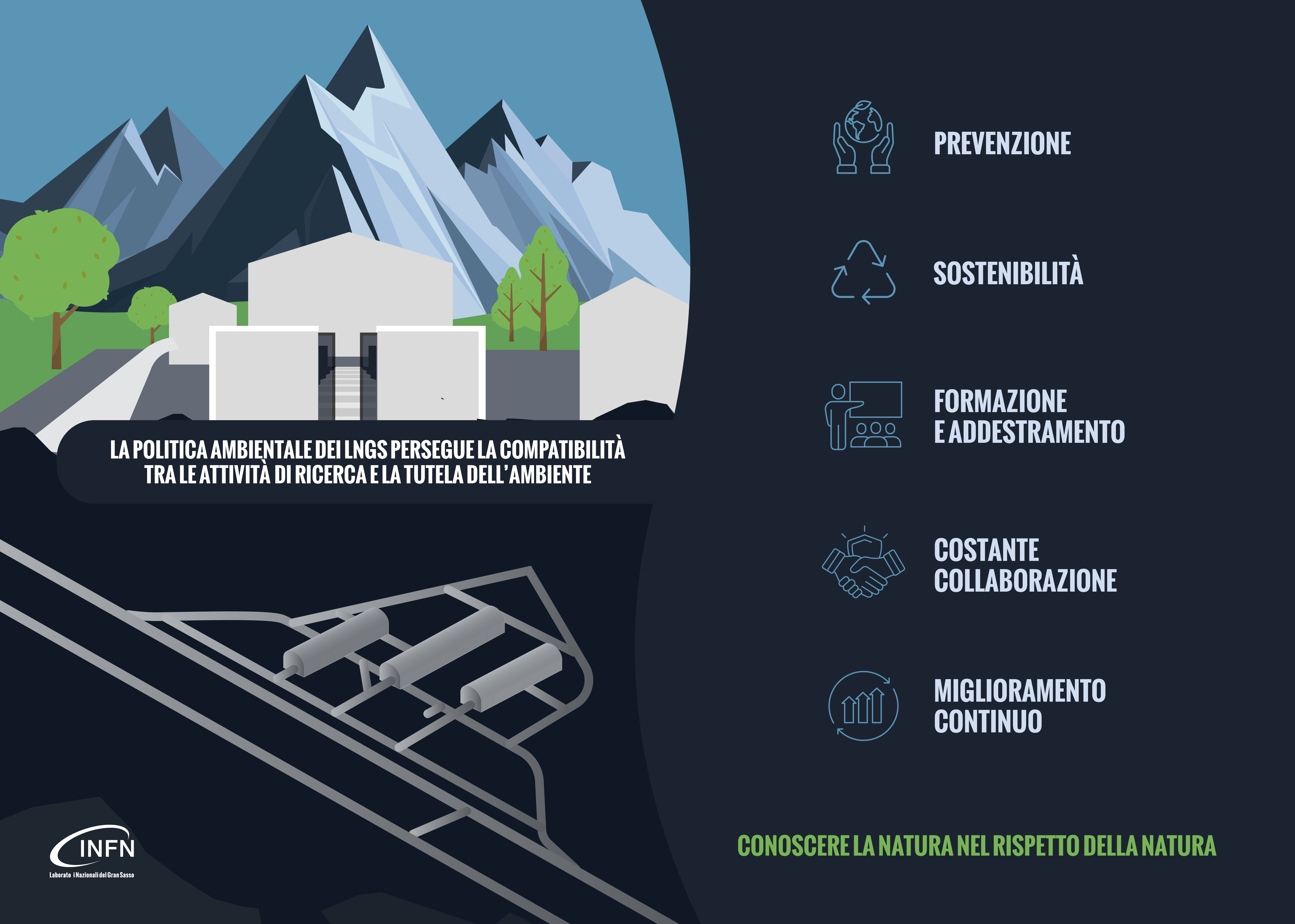 L’impegno ambientale dei Laboratori coinvolge le collaborazioni nazionali e internazionali garantendo la compatibilità tra le attività di ricerca e la salvaguardia dell’ambiente e del territorio. Sin dalla fase di ideazione e preparazione degli apparati sperimentali ogni esperimento viene valutato nel suo intero ciclo di vita, con l’obiettivo di garantire uno sviluppo sostenibile, nel rispetto del territorio circostante.